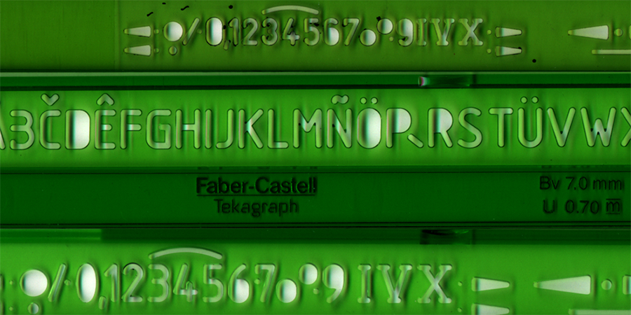 One example is the technical sans serif: letters drawn by engineers and architects, using only straight lines and simple circular arcs, often with the aid of grids or stencils. Their “undesigned” appearance exerts a strange attraction to many designers fascinated by their modularity and strict geometry. Among others, this has resulted in a multitude of adaptations of the alphabets devised by the Deutsches Institut für Normung, the German Institute for Standardization, such as DIN 1451.